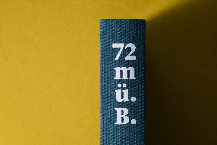 72 Meter über Bern – Fotografien von Dominique Uldry vom Dach des ehemaligen PTT-Turms in Bern. Gebunden in DUCHESSE petrol und Vorsatz/Nachsatz aus SURBALIN senfgelb.