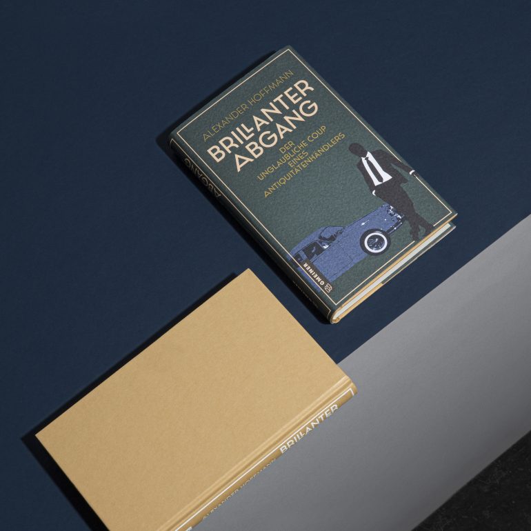 Ein besonders haptisch-griffiges Lesevergnügen – der Schutzumschlag in PEYPRINT bison und sowohl Einband, als auch Vorsatz/Nachsatz in SURBALIN glatt havanna und schwarzblau. Dieser Roman von Alexander Hoffmann über den unglaublichen Coup eines Antiquitätenhändlers begeistert gleich 3 x mit Peyer Materialien.