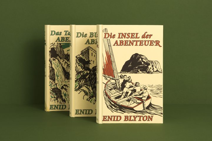 Der Bocola Verlag veröffentlicht seit April letzten Jahres die exklusive Edition der Abenteuer-Reihe. Alle acht Bände basieren auf der Gestaltung der englischen Originalausgaben vom Macmillan Verlag aus den 1940er- und 1950er-Jahren. Im Gegensatz zu den ursprünglichen deutschen Ausgaben, bei denen viele Abbildungen weggelassen wurden, enthalten die bis ins letzte Detail liebevoll gestalteten Nostalgie-Bände alle Illustrationen von Stuart Tresilian. Diese wurden vom Verlag aufwändig digital restauriert und schmücken nun nicht nur die Innenseiten, sondern auch den Bucheinband aus SURBALIN chamois mit der Prägung honan. Die leinenartige Oberflächenstruktur des gelblichen Bezugsmaterials rundet die dem Original nachempfundene Gestaltung ab.