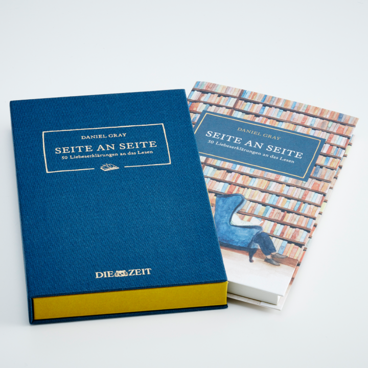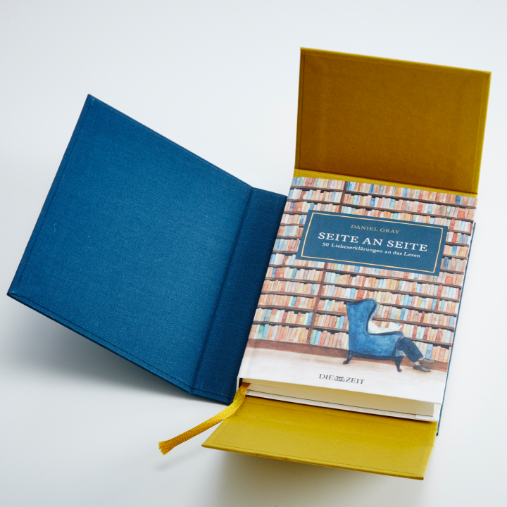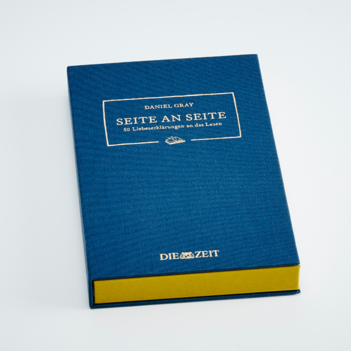 Wir freuen uns, dass sich der Zeit-Verlag für die exklusiv im Zeit Shop erhältliche Ausgabe „Seite an Seite – 50 Liebeserklärungen an das Lesen“ von Daniel Gray für einen hochwertig gestalteten Faltschuber als Alternative zu einem typischen Buchschuber entschieden hat. Die Idee basiert auf der BuchBox. Diese wurde von Kolbus entwickelt und von Peyer Graphic als Alternative zu dem klassischen Buchschuber präsentiert. Als Inspiration für eine Buchausstattung, die mit den Sinnen des Lesers kokettiert. Die Besonderheit sind die versteckten Magnete sowie die Möglichkeit, Materialien, Oberflächen und Farben zu kombinieren. Der Faltschuber umschließt das Buch auf ganz besondere Weise, und bereits die Annäherung an das Buch wird zu einem Erlebnis, das Lust auf mehr macht.