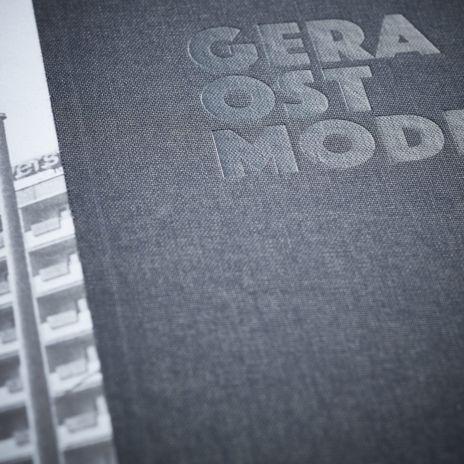 Der Halbgewebeband Gera Ost Modern, erschienen bei spehere publishers, wurde mit dem zweifarbigen Gewebe DOUBLESSE in granitschwarz sowie dem weißen Bezugsmaterial PEYPRINT gefertigt.