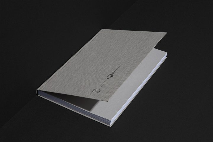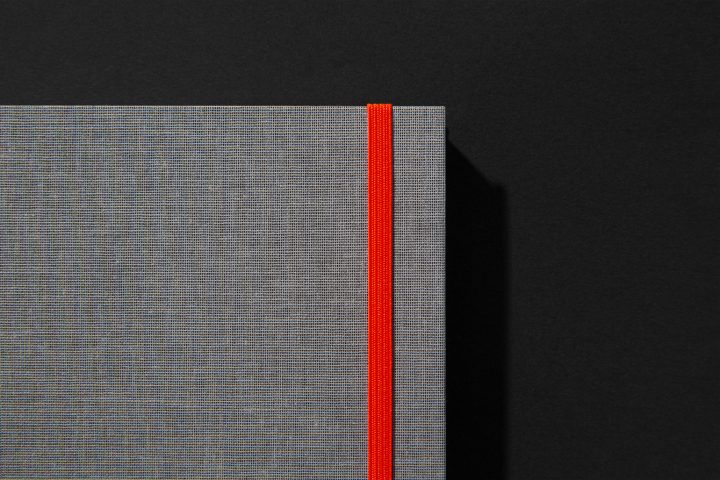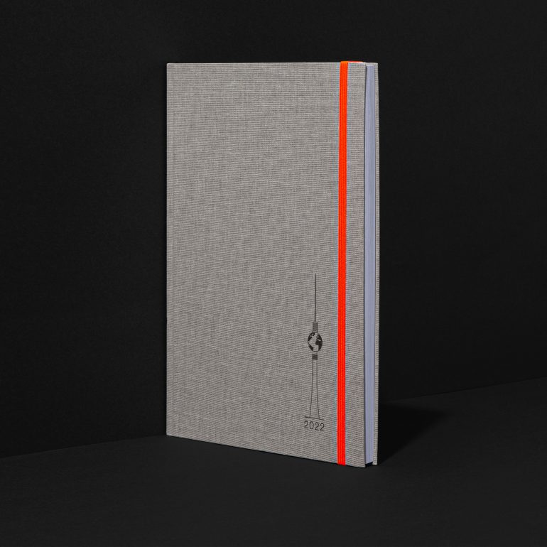 Kreativ im Hinblick auf das Zusammenspiel von FSC®-zertifiziertem DOUBLESSE marmorbraun im Bezug, strahlend neon-orangenem Gummiband und feiner Folienprägung des Berliner Fernsehturms als Motiv.