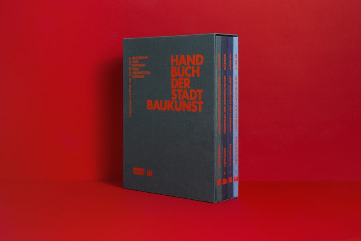 Im Schuber vereint befinden sich vier Bände zum Thema Stadtbaukunst. Der Schuber sowie die vier Bücher sind in unterschiedlichen Blautönen des PRINCESSE-Gewebes gebunden. Die grafische Umsetzung übernahm die Grafikerin Antonia Henschel. Sie entschied sich für leuchtend orangefarbene Heißfolienprägungen auf allen Covern sowie auf dem Schuber.
