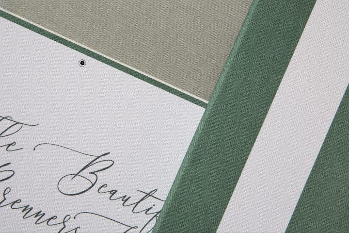 Dieses wurde beim Überzug des Buches mit den Pantone-Sonderfarben Grün 625 (abgewandelt) und Grau 445c im Offsetdruck bedruckt. Der Schuberbezug wurde 1/0-farbig, ebenfalls mit Pantone Grün 625 (abgewandelt), bedruckt. Für beide Bezüge kam eine Ryobi Druckmaschine zum Einsatz.