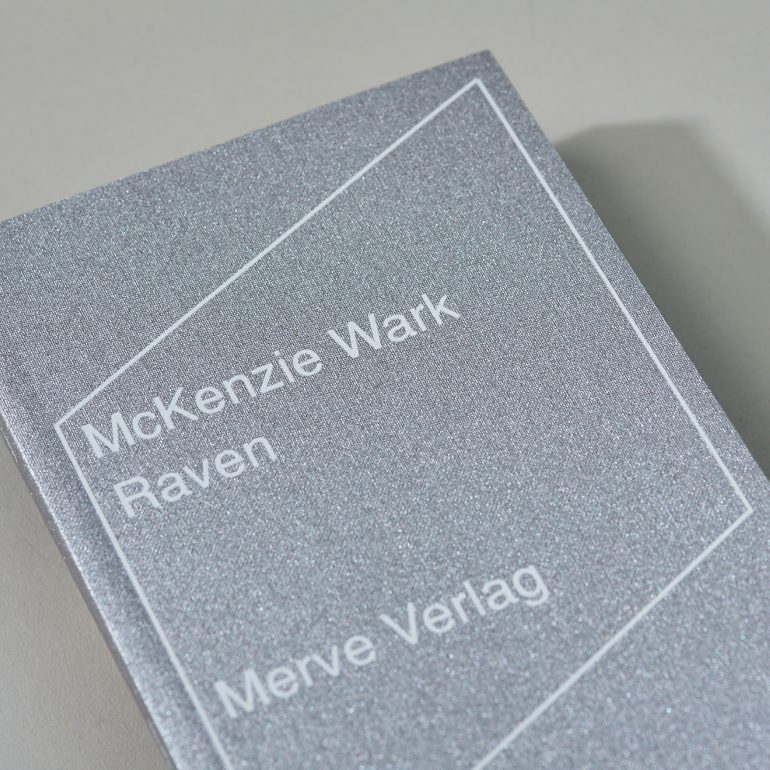 Für den Umschlag der kleinen Broschur "Raven" von McKenzie Wark wählte der Merve Verlag das glitzernde DUCHESSE metallic silber. Der Name der Autorin, Titel und Verlagsname sind im Siebdruckverfahren auf das Cover gedruckt. Ebenso die Rauten auf Vorder- und Rückseite, die in der verlagstypischen reduzierten Gestaltung ein aufgeschlagenes Buch darstellen.
