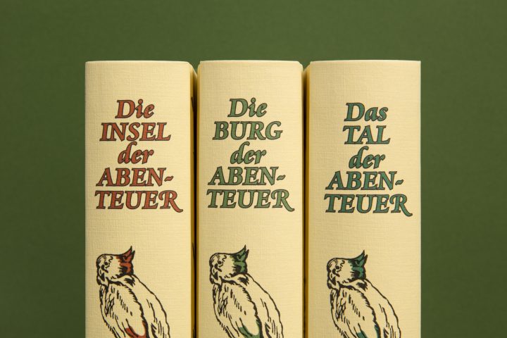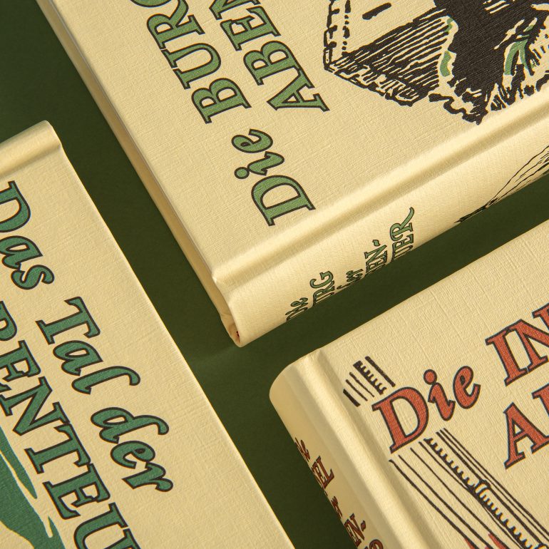 Der Bocola Verlag veröffentlicht seit April letzten Jahres die exklusive Edition der Abenteuer-Reihe. Alle acht Bände basieren auf der Gestaltung der englischen Originalausgaben vom Macmillan Verlag aus den 1940er- und 1950er-Jahren. Im Gegensatz zu den ursprünglichen deutschen Ausgaben, bei denen viele Abbildungen weggelassen wurden, enthalten die bis ins letzte Detail liebevoll gestalteten Nostalgie-Bände alle Illustrationen von Stuart Tresilian. Diese wurden vom Verlag aufwändig digital restauriert und schmücken nun nicht nur die Innenseiten, sondern auch den Bucheinband aus SURBALIN chamois mit der Prägung honan. Die leinenartige Oberflächenstruktur des gelblichen Bezugsmaterials rundet die dem Original nachempfundene Gestaltung ab.