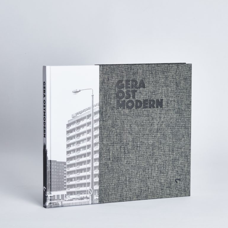 Der Halbgewebeband Gera Ost Modern, erschienen bei spehere publishers, wurde mit dem zweifarbigen Gewebe DOUBLESSE in granitschwarz sowie dem weißen Bezugsmaterial PEYPRINT gefertigt.