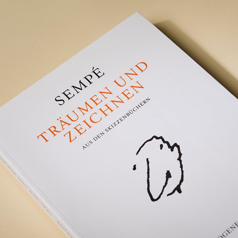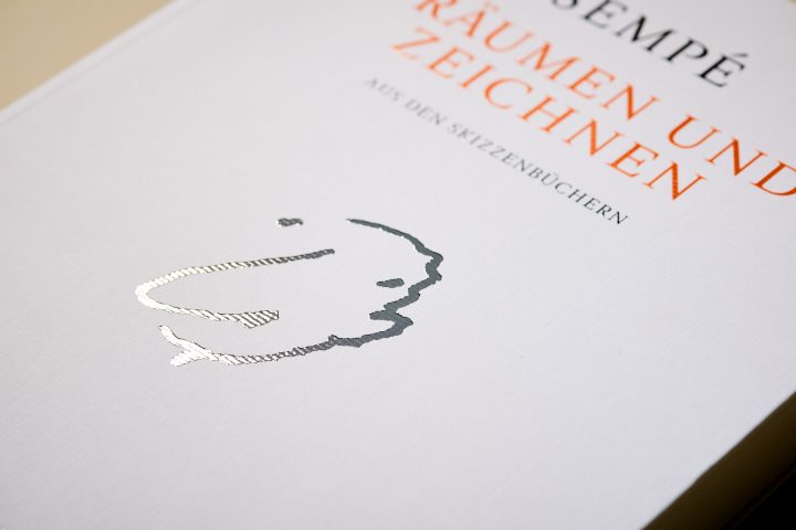 "Träumen und zeichnen" ist ein liebevoll gefertigter Band, der dem Leser einen Blick über die Schulter von Sempé gewährt. Als Umschlag der großformatigen Klappenbroschur dient das weiße Naturpapier PEYPRINT java, dessen Oberflächenstruktur an Büttenpapier erinnert. Darauf abgebildet ist eine Skizze und der Titel. Die feinen Linien in Schwarz und Orange sind mit Lack versehen und es entsteht der Eindruck, als wären sie erhaben. Die Gestaltung in Kombination mit dem charmant schlichten Papier fasst trotz ihrer Unaufgeregtheit alles zusammen, was die Zeichenkunst Sempés ausmacht. Ein tolles Buch - nicht nur für Sempé-Liebhaber - und zugleich eine Hommage an den einmaligen Künstler. Erschienen beim Diogenes Verlag.