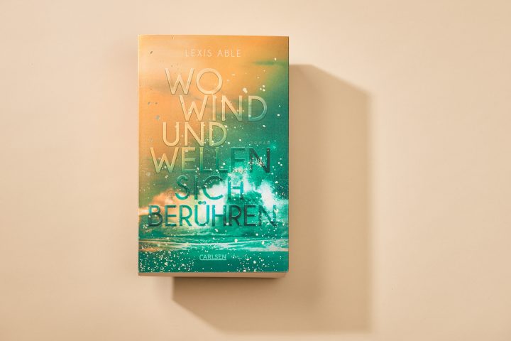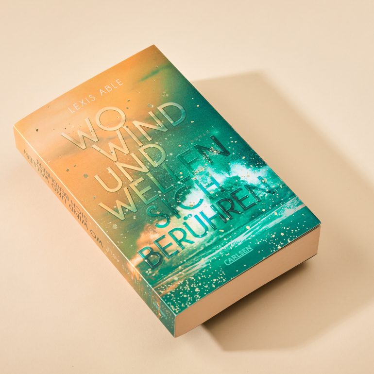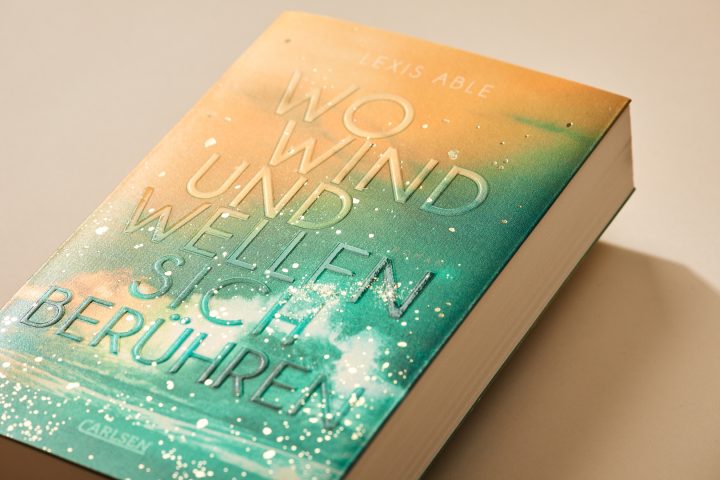 Der Titel "Wo Wind und Wellen sich berühren" von Lexis Able fällt durch die Material- und Veredelungskombination ins Auge. Für den Umschlag der Klappenbroschur wählte der Carlsen Verlag SURBALIN perleffekt in 275 g/m². Wird das perlmuttschimmernde Material wie hier im Offset bedruckt, ergeben sich spannende Effekte. Mit goldener Heißfolienprägung wurden weitere Gestaltungselemente umgesetzt. Der Titel ist zudem hochgeprägt und das Wort "Wellen" mit einem Glanzlack versehen.