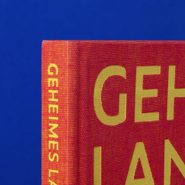 The book "Geheimes Land" by Anne Heinlein suggests a rather bright theme at first glance. The book jacket DOUBLESSE blutorange shines brightly towards the reader. The designer Uta Oettel decided for a hot foil stamping on the cover in rich yellow, which fits to this very well. Also the end paper SURBALIN is shining in "sonnengelb". But the author considers a very dark theme of the history in the GDR: For the book the photographer explored the restricted areas of the NVA and the GSSD and she also investigated in the archives of the Stasi. Photos were created of "unconscious forest, dense brushwood or undergrowth that obscures the view into the distance and thus becomes a natural stage. In addition, reproductions were made from school soldier teaching material on war and combat strategies, as well as a discovery of photographs for propaganda purposes that virtually glorify these strategies." (www.fotohof.net)