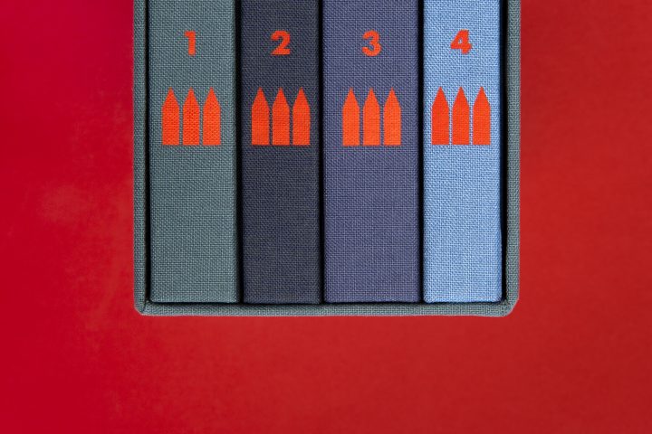 The slipcase contains four volumes on the subject of urban construction art. The slipcase as well as the four books are bound in different shades of blue of the PRINCESSE fabric. The designer Antonia Henschel was responsible for the graphic realisation. She chose bright orange hot-foil embossing for all covers and for the slipcase.
